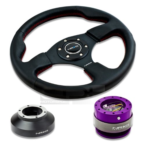 NRG-SRK-131H+012R+200PP, NRG Innovations 12.5" 320mm Black Leather Red Stitch Button Racing Steering Wheel Combo with 6 Hole Short Hub Adapter with Gen 2.0 Purple Quick Release Kit SRK-131H?NRG Quick Release features many options that conventional ball-locking quick release system do not. It is specially engineered with raised sections to prevent the scratching and stretching of the hub while a self locking feature adds increased safety and functionality. Features racing styled for added style and look. Each unit is made from the highest quality aircraft grade aluminum and is anodized for maximum durability and finish.