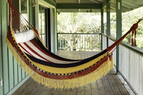#The El Gringo hammock from Lazy Bandido is the perfect hammock for proud patriots who want to relax indoors, outdoors, or under the shadow of two evenly spaced flagpoles. The hammock is hand-woven by skilled artisans in Masaya, Nicaragua using a double weave technique for ultimate comfort and durability while allowing hammock to stretch and conform to your individual body shape. The hammock supports 400 pounds and the bed portion measures 7 feet long by 4 feet wide. Large enough to fit any adult, some small couples, and certain small horse breeds. The hammock ends hang about 10 feet apart and require a minimum hanging space of 10 to 12 feet for comfortable use. Includes 1 hammock. Spreader pillow and hanging kit not included. The El Gringo hammock features a deep red, navy blue, white, and yellow stripe pattern. 1-year warranty.